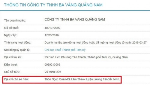 Theo đó, ngày 17/3/2016 Công ty TNHH Ba Vàng Quảng Nam đăng ký lần đầu mã số doanh nghiệp 4001070092, trụ sở tại 40 Trần Phú, phường Tân Thạnh, TP Tam Kỳ, Quảng Nam. Vốn điều lệ 1.000.000 đồng. Chủ sở hữu và người đại diện theo pháp luật là ông Nguyễn Xuân Huy (32 tuổi, trú tổ 8, khu 2, phường Vàng Danh, TP Uông Bí, Quảng Ninh).
