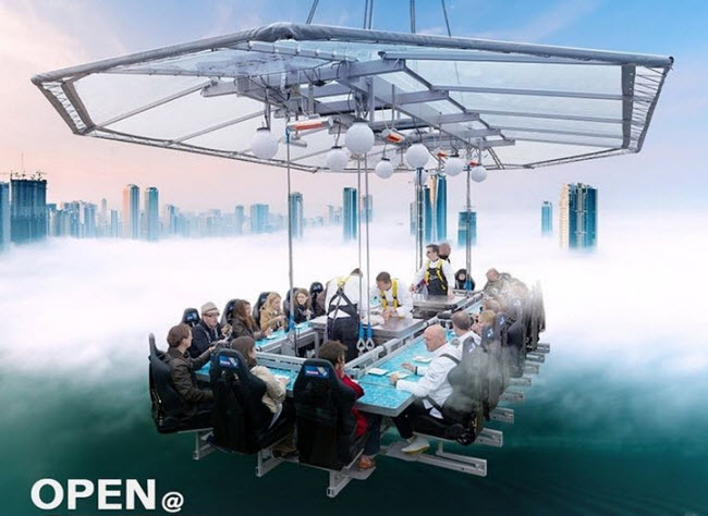 Bàn ăn của nhà hàng được treo trên không cách mặt đất 50m bởi một cần cẩu lớn. Nếu bạn thích trải nghiệm mạo hiểm và ẩm thực, thì đây là địa điểm lý tưởng không thể bỏ qua.