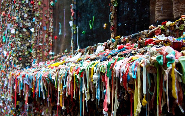 Gum Wall rất nổi tiếng ở khu vực chợ cá Pike Place, bang Washington. Những bức tường bằng kẹo cao su nhiều màu sắc, thu hút rất nhiều du khách và nhiếp ảnh gia ghé đến. Tuy nhiên, nơi này có mùi hôi và gây ô nhiễm cho cả khu phố nên người ta quyết định phá hủy nó.