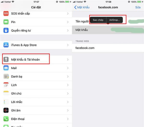Khi cần chia sẻ mật khẩu WiFi hay thông tin nào đó với bạn bè hoặc thành viên gia đình ? Bạn chỉ cần nhấn và giữ vào trường mật khẩu trong Cài đặt >Mật khẩu & Tài khoản, nhấn giữ vào mật khẩu đã lưu và lựa chọn tùy chọn AirDrop để gửi qua mạng không dây.