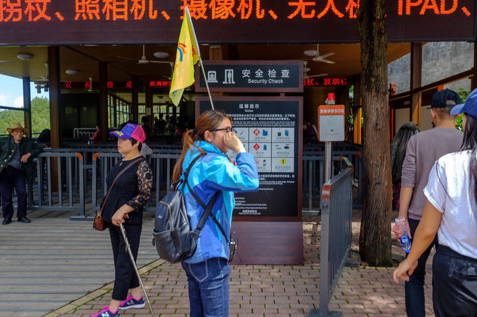 Đầu tiên, khách du lịch phải đi qua các lớp an ninh với máy X-quang, máy dò kim loại. Những vật dụng như balo, máy ảnh không được mang lên cầu mà phải gửi lại. Tuy nhiên, khách không thể dùng tiền mặt để thuê các tủ đồ mà phải thanh toán bằng WeChat và AliPay, hai ứng dụng phổ biến ở Trung Quốc. Cuối cùng, Harrison phải đưa tiền cho một nhân viên và nhờ thanh toán bằng tài khoản của người này.