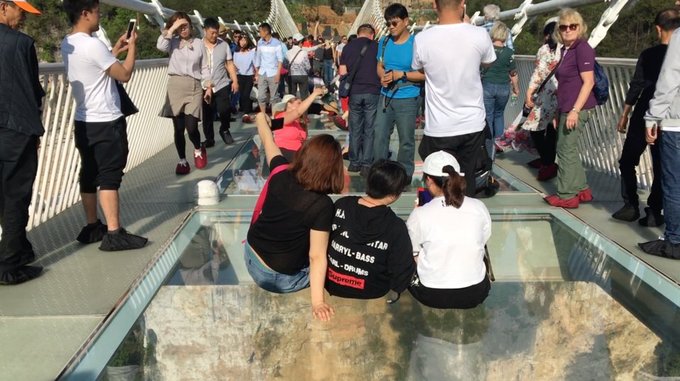 Khách Mỹ thất vọng khi đến cầu kính cao nhất thế giới ở Trung Quốc. Lượng khách du lịch đổ về đây quá đông. Không ít người phải chờ đợi lâu mới tới lượt và trải nghiệm không trọn vẹn khi mặt kính bị xước nhiều.