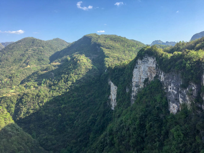 Những ngọn núi đá vôi của rừng quốc gia Trương Gia Giới nhìn từ cây cầu.