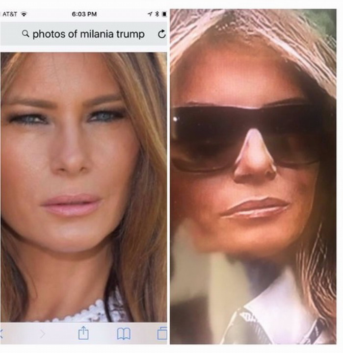 Đệ nhất phu nhân Melania Trump đôi khi được thay thế bởi một người phụ nữ khác giấu sau cặp kính râm lớn và trang phục tương tự xuất hiện khi ông Trump thực hiện chuyến đi đến địa điểm của cơn lốc xoáy chết người ở Alabama. Để ý kỹ bạn sẽ thấy không một ai chụp được mặt bà Melania khi bà bỏ kính râm xuống.
