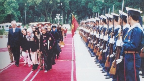 Ngày 29/12/1994, Nhà nước ta phong tặng danh hiệu Bà mẹ Việt Nam Anh hùng đợt 1, Chủ tịch nước Lê Đức Anh cùng các Bà mẹ Việt Nam Anh hùng duyệt đội danh dự tại Phủ Chủ tịch. Ảnh tư liệu