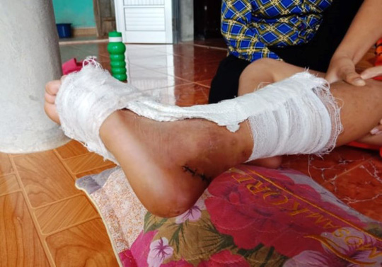 Em V. được sơ cứu và sau đó được đưa tới Bệnh viện Đa khoa huyện Triệu Sơn cấp cứu. Tại đây, các bác sĩ chẩn đoán em V. bị đứt tới 2/3 gót chân trái, phải khâu vết thương, bó bột để giữ không cho gân dịch chuyển.