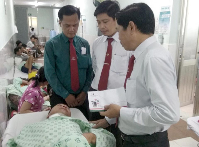 Tài xế Tuấn được lãnh đạo hãng taxi Vinasun thăm hỏi, hỗ trợ 5 triệu đồng. Ảnh: Ngọc Quynh.