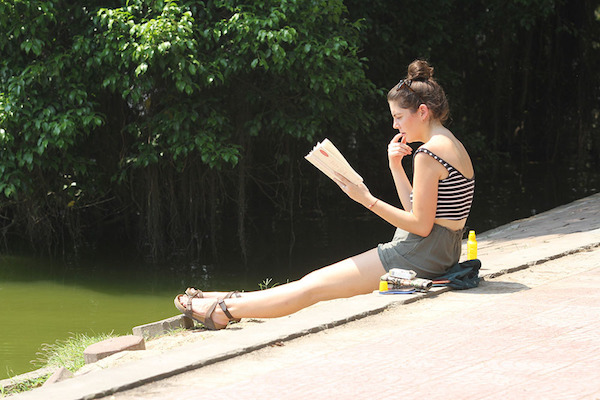 Vị khách Tây trải nghiệm cảm giác đọc sách giữa trời nắng nóng cạnh hồ Gươm
