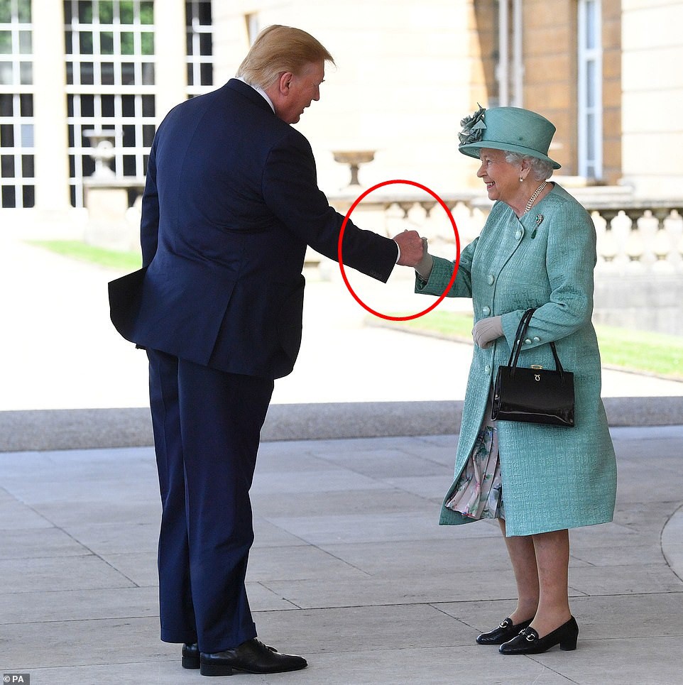 Theo trang Mirror, Tổng thống Trump một lần nữa lại phá vỡ quy tắc Hoàng gia khi thay vì bắt tay Nữ hoàng, dường như người đứng đầu Nhà trắng lại chào bằng một nắm đấm tay.