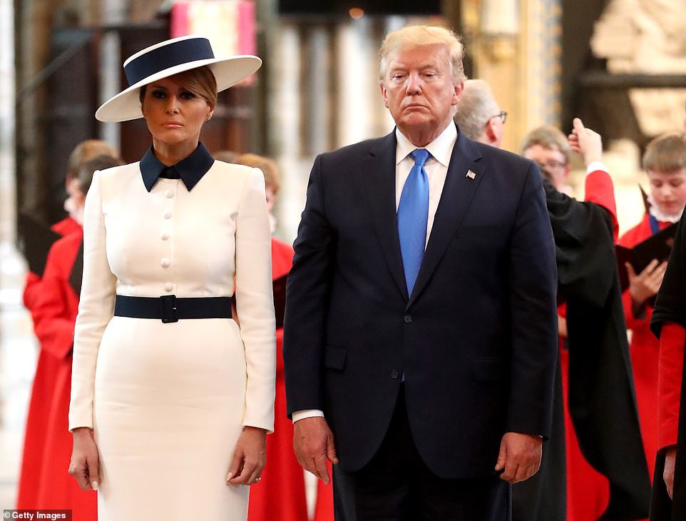 Bà Melania tiếp tục gây ấn tượng khi lựa chọn một chiếc đầm màu trắng thanh lịch và đội chiếc mũ kiểu cách phù hợp. Vợ chồng Tổng thống Trump tiếp tục di chuyển vào Cung điện Buckingham để gặp gỡ Nữ hoàng Anh và được chào đón bằng nghi thức long trọng nhất.