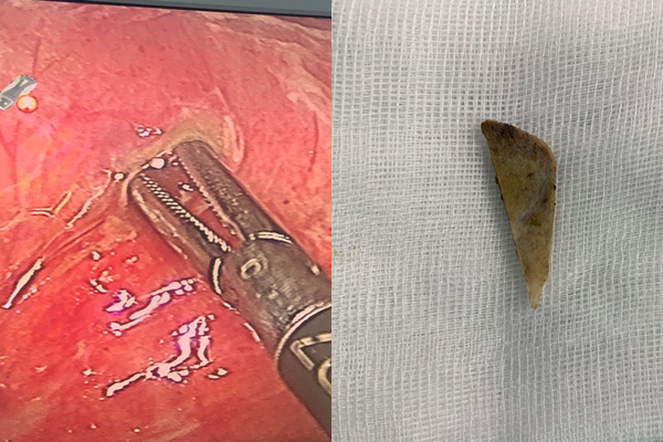 Qua chụp cắt lớp vi tính, bác sĩ chẩn đoán: có dị vật trong lòng ruột non, nghi do mảnh xương. Sau đó, bệnh nhân được phẫu thuật nội soi lấy dị vật là mảnh xương sườn với kích thước chiều dài 5cm, chiều rộng 1cm và khâu kín lại lỗ thủng ruột non.