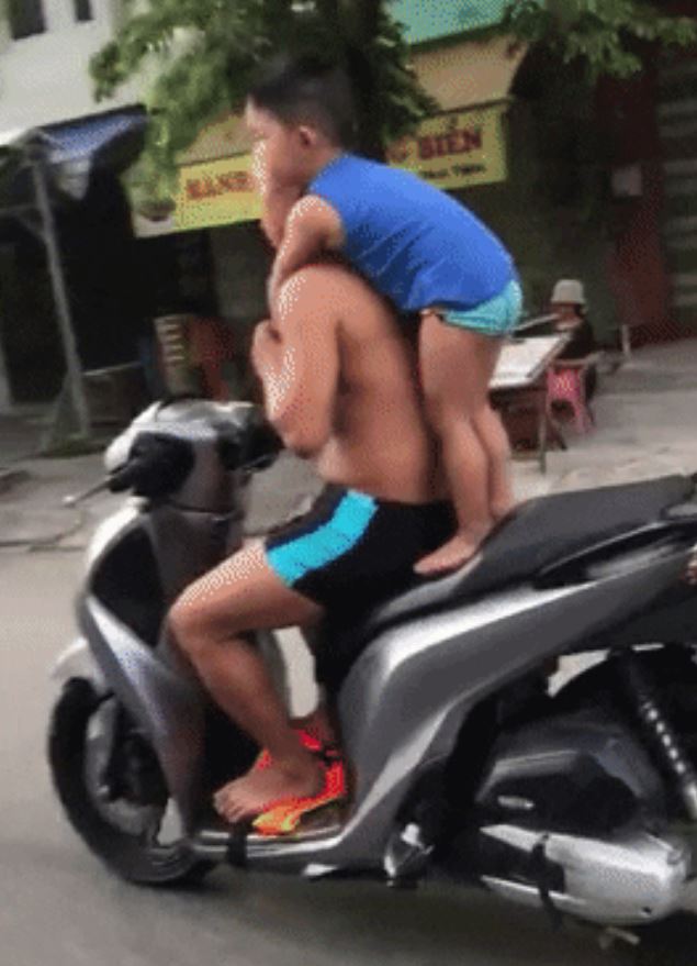 Ông bố này dùng một tay để giữ tay con và điều khiển xe máy chỉ bằng một tay còn lại, bất chấp nguy hiểm cho chính mình và con cũng như với các phương tiện khác đang lưu thông trên đường.