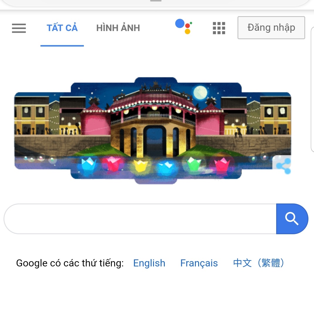 Thật đáng tự hào phả không các bạn. Lần đầu tiên Google vinh danh 1 thành phố của Việt Nam lên trang chủ. Vào một buổi sang đẹp trời hình ảnh phố cổ Hội An với biểu tượng Chùa Cầu, hoa đăng xuất hiện tại bộ công cụ tìm kiếm trên trang chủ của Google.