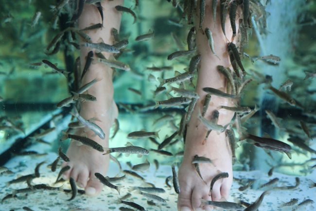 Tại sân bay Singapore, thay vì chăm sóc, mát xa chân truyền thống, các spa cung cấp dịch vụ mát xa và tẩy tế bào chết cho chân bằng cách cho chân ngâm vào hồ có bầy cá nhỏ. Ban đầu bạn sẽ thấy hơi nhột nhưng sau đó là cảm giác rất dễ chịu.