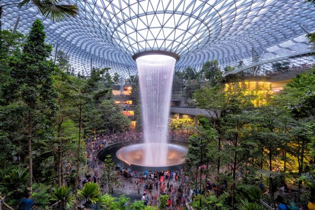 Các cửa hàng có mặt khắp nơi trong các sân bay nhưng không phải ở đâu cũng có trung tâm thương mại lớn. Ở sân bay Singapore có trung tâm thương mại The Jewel gồm 10 tầng với những thác nước trong nhà cao 130 feet, hơn 280 cửa hàng cùng 1 khu vườn tươi tốt, cây cầu trên cao 165 feet, hai mê cung, cầu trượt khổng lồ, siêu thị và rạp chiếu phim. Nó có một công viên giải trí dành cho người lớn hấp dẫn đến mức bạn có thể vô tình bỏ lỡ chuyến bay của mình.