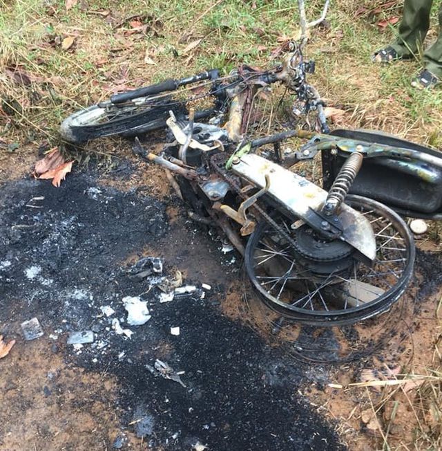 Chiếc xe máy bị cháy rụi cách nơi phát hiện thi thể nạn nhân không xa.