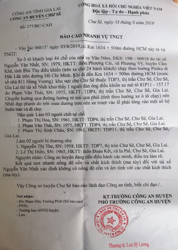 Thông tin ban đầu, ba người đang đi chợ bị tông chết là bà Phan Thị H. (58 tuổi, ở tổ dân phố 6), ông Phan Văn Thái (44 tuổi, tổ dân phố 4) và bà Phạm Thị Sinh Châu (58 tuổi, tổ dân phố 11, thị trấn Chư Sê).