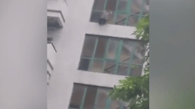 Nam thanh niên đu bám vào khung sắt cửa sổ tầng 6 chung cư. Ảnh cắt từ clip.