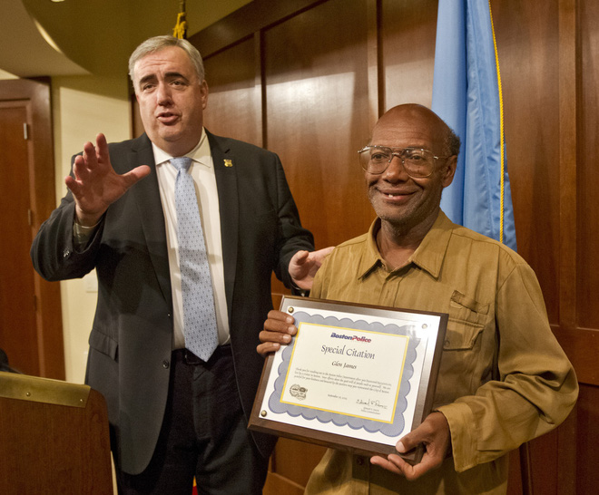 Ông Glen James được cảnh sát Boston trao tặng bằng khen cho hành động đẹp của mình. (Nguồn: Boston Herald)