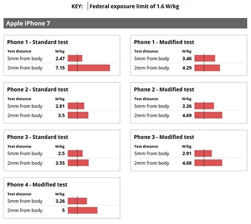 Thử nghiệm cho thấy iPhone 7 là smartphone có chỉ số cao gấp đôi mốc trên ở cả khoảng cách 2mm và 5mm, đồng thời cũng cao gấp đôi kết quả do chính Apple đưa ra trước khi bán smartphone này. Tuy nhiên, Samsung Galaxy S8 mới là smartphone có chỉ số tệ nhất ở khoảng cách 2 mm, khi tỷ lệ lên đến 8,22 W/kg.