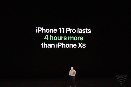iPhone 11 Pro có thời lượng pin lâu hơn iPhone XS Max 4 tiếng trong khi iPhone 11 Pro Max là 5 tiếng. Bên cạnh đó, Apple nâng cấp sạc nhanh trên iPhone từ 15 watt lên 18 watt.