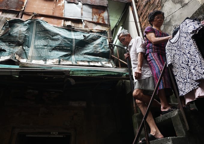 Chính xác diện tích “nhà” của ông Nguyễn Phùng Hải (80 tuổi) và vợ là bà Nguyễn Thị Xâm (70 tuổi) cùng cô con gái (26 tuổi) chỉ rộng có 8 mét vuông, được dựng trên nóc nhà vệ sinh công cộng chung của sáu căn hộ bên dưới trong một con hẻm nhỏ ở giữa phố Hàng Bạc, quận Hoàn Kiếm (Hà Nội).