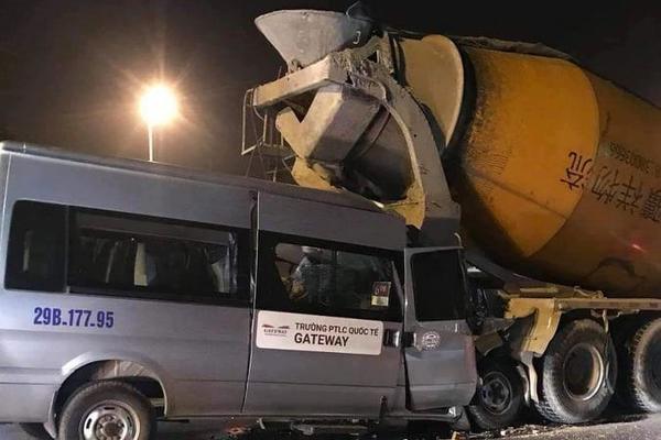 Tối qua xe 16 chỗ của trường quốc tế Gateway đâm vào đuôi xe bồn. Công an huyện Đông Anh sáng nay cho biết đang thụ lý giải quyết vụ tai nạn liên quan đến ô tô 16 chỗ với xe bồn bê tông.