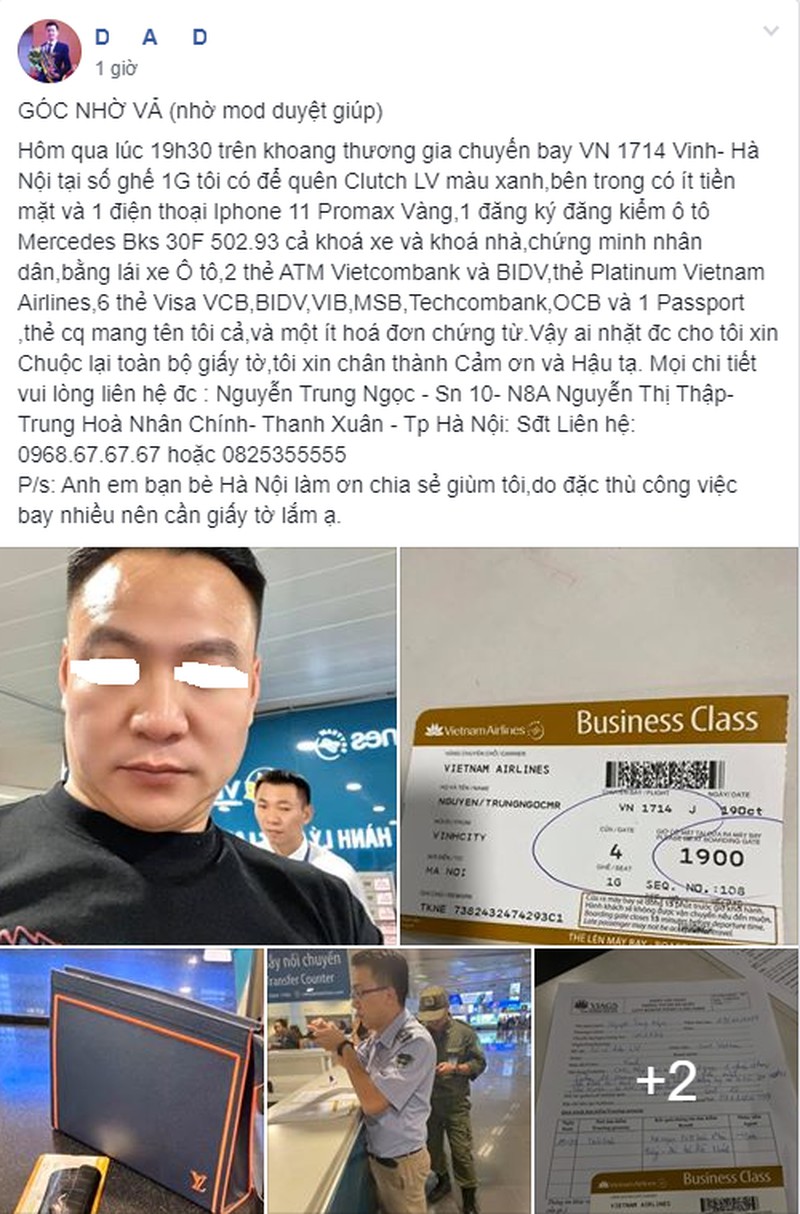 Theo đó, thành viên Duc Anh Duong chia sẻ và nhờ vả cộng đồng OFFB hỗ trợ giúp đỡ: "Hôm qua, lúc 19h30 trên khoang thương gia chuyến bay VN 1714 Vinh - Hà Nội tại số ghế 1G, tôi có để quên Clutch LV màu xanh, bên trong có ít tiền mặt và 1 điện thoại Iphone 11 Promax Vàng, 1 đăng ký đăng kiểm ô tô Mercedes BKS 30F 502.93 cả khoá xe và khoá nhà, chứng minh nhân dân, bằng lái xe Ô tô, 2 thẻ ATM Vietcombank và BIDV, thẻ Platinum Vietnam Airlines, 6 thẻ Visa VCB, BIDV, VIB, MSB, Techcombank, OCB và 1 Passport, thẻ cơ quan mang tên tôi cả và một ít hoá đơn chứng từ.
