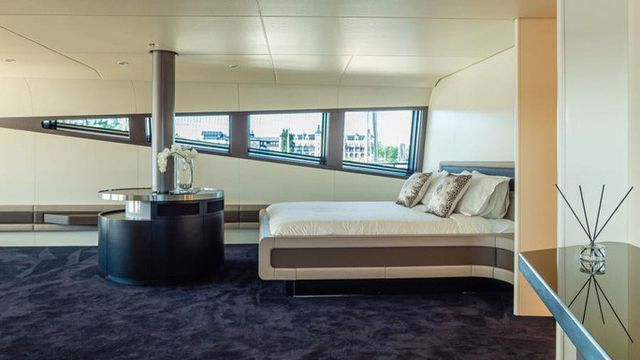 Bên trong Royal Falcon One có 4 cabin dành cho hành khách rộng rãi và 1 phòng lớn tích hợp sàn riêng, bể sục, quầy bar, phòng quan sát… Nội thất hiện đại của siêu du thuyền gồm màu trắng và xanh, kết hợp với bề mặt kim loại và gỗ.