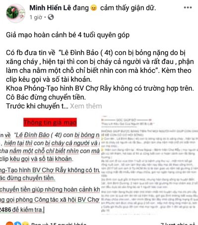 Mọi người muốn quyên góp ủng hộ thì hãy tìm hiểu thật kỹ kẻo lòng tốt bị kẻ xấu lợi dụng. Trường hợp bệnh nhi bị phỏng nặng và số tài khoản được đăng tải trên Facebook để kêu gọi ủng hộ giúp em là lừa đảo.