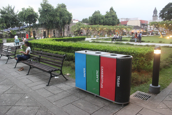 Thùng đựng rác phân loại ở bên trong khu du lịch Intramuros, thủ đô Manila - Ảnh: MINH KHUÊ