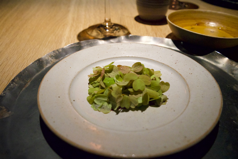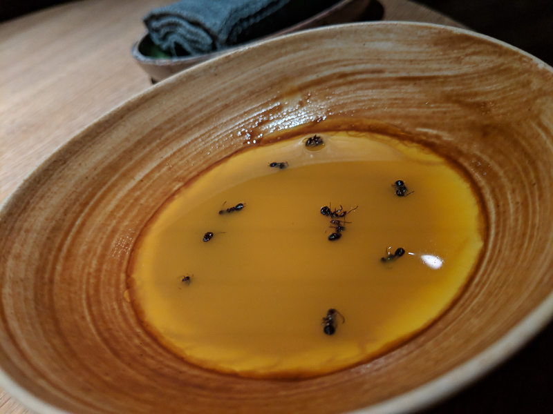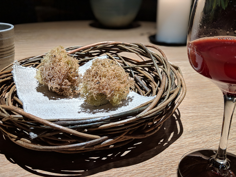 Món đầu tiên là súp nấm, nhưng bạn sẽ không tìm thấy nấm đâu cả ngoài một đống rêu và một cái nón thông bên trên. Phục vụ sẽ giải thích rêu và nón thông không ăn được, bên dưới mới là món súp nấm.