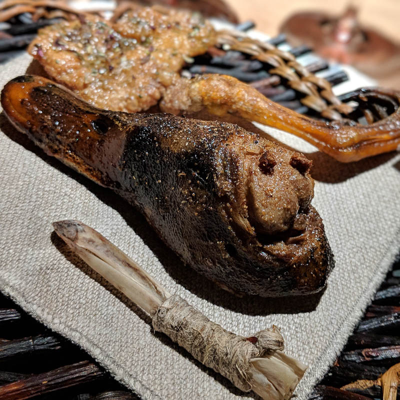 Một miếng ức thịt vịt nhỏ được tẩm bột chiên nhưng vẫn rất mềm. Điều đáng nói là nó được đặt trên một chiếc cánh của con vịt khiến người ăn cảm giác như đang nhai sống.