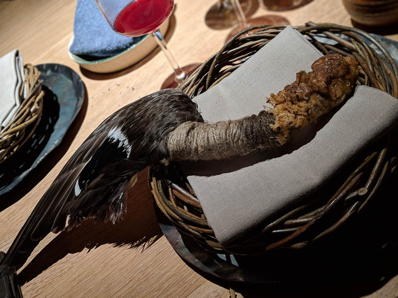 Một chiếc bánh quy được tạo hình như lông vũ, ăn cùng với nấm truffle đen trên cỏ khô.