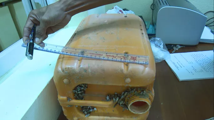 Nhiều con sò bám vào can nhựa, có khả năng can nhựa đã ở trên biển đã một thời gian