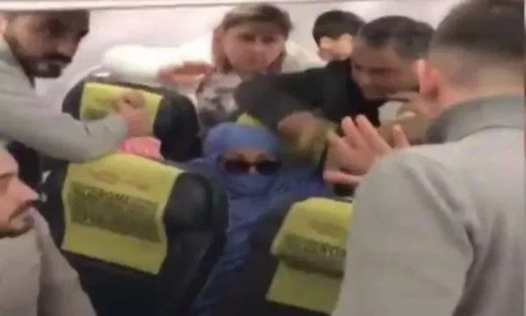 Hành khách khống chế người phụ nữ đeo kính đen, đội khăn trùm đầu màu xanh dương trên chuyến bay của Pegasus Airlines hôm 18/12. Ảnh: Sun.