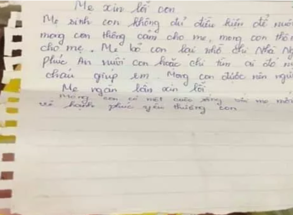 Trong bức thư, người mẹ viết: "Mẹ xin lỗi con, mẹ sinh con không đủ điều kiện để nuôi con, mong con thông cảm cho mẹ. Mẹ bỏ con lại nhờ chị nhà nghỉ Phúc An nuôi con hoặc chị tìm ai đó nuôi cháu giúp em, mong con được nên người, mẹ ngàn lần xin lỗi. Mong con có cuộc sống với mẹ mới vui vẻ hạnh phúc yêu thương con".
