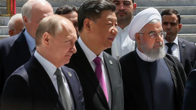 Tổng thống Iran Hassan Rouhani (ngoài cùng bên phải), Chủ tịch Trung Quốc Tập Cận Bình (giữa) và Tổng thống Nga Vladimir Putin chụp ảnh chung tại hội nghị của Tổ chức Hợp tác Thượng Hải ở Kyrgyzstan tháng 6/2019. (Ảnh: Press TV)