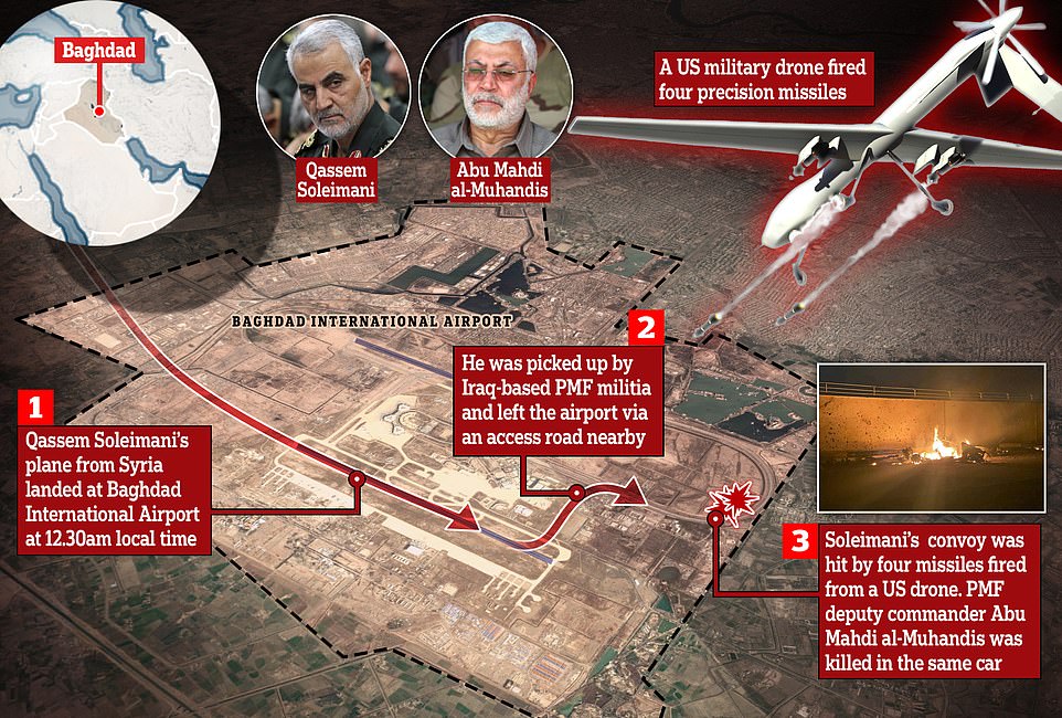 Ba ngày sau, một máy bay không người lái của Hoa Kỳ bay trên vùng trời Baghdad, đợi. Khi thấy Soleimani rời khỏi sân bay, nó phóng hỏa tiễn, giết chết ông ta và Abu Mahdi al-Muhandis, phó chỉ huy của lực lượng dân quân được Iran hậu thuẫn gọi là Lực lượng Lưu động Nhân dân.