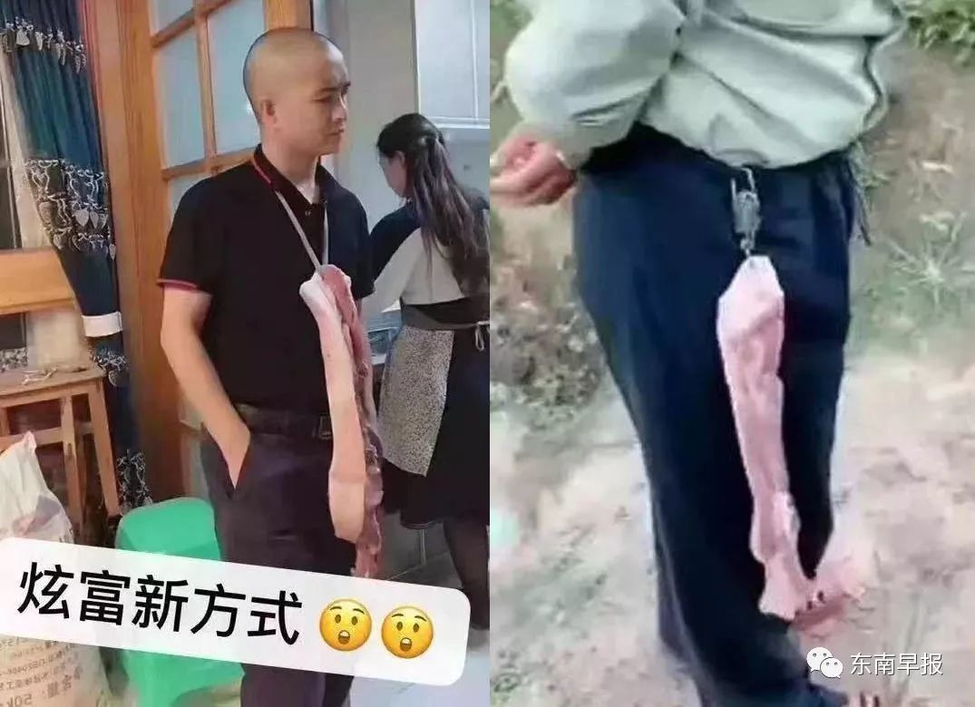 Trong một bức ảnh được đăng trên trang web hài hước “Fun48”, một người đàn ông đeo “dây chuyền thịt heo” trên cổ với lời chú thích: “Một cách mới để thể hiện sự giàu có. Có thịt lợn là có tiền, người đàn ông này rất giàu có!”.