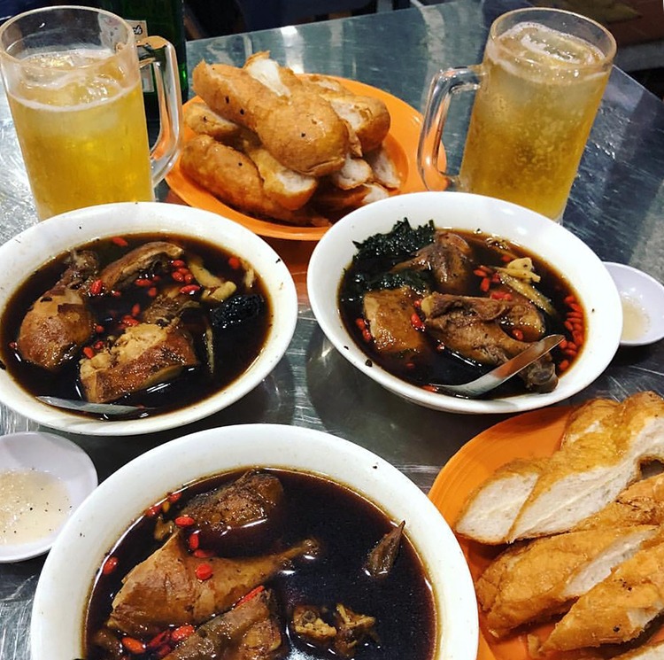 Nằm ở số 29, bên dưới một gốc cây si là quán ăn gợi ý cho du khách. Món chính ở đây là gà ác hầm thuốc bắc, ăn kèm mì hoặc bánh mì rán mật ong. Điểm cộng của món gà là thịt mềm, nước dùng ngọt với 7 loại thảo mộc. Mỗi bát gà tần kèm theo ngải cứu giá 80.000 đồng, bánh mì là 10.000 đồng một chiếc. Ảnh: Stefanlee.