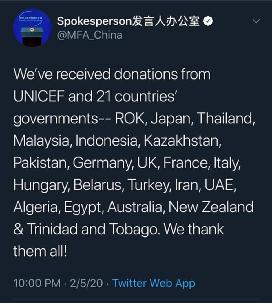 Theo Twitter của phát ngôn viên của Bộ ngoại giao Trung Cộng đăng tải ngày 05/2, Bắc Kinh cảm ơn Quỹ Nhi đồng Liên Hợp quốc (Unicef) và 21 quốc gia đã cung cấp hỗ trợ cho Trung Cộng để đối phó với dịch viêm phổi cấp đang hoành hành tại quốc gia hơn 1.4 tỷ dân.