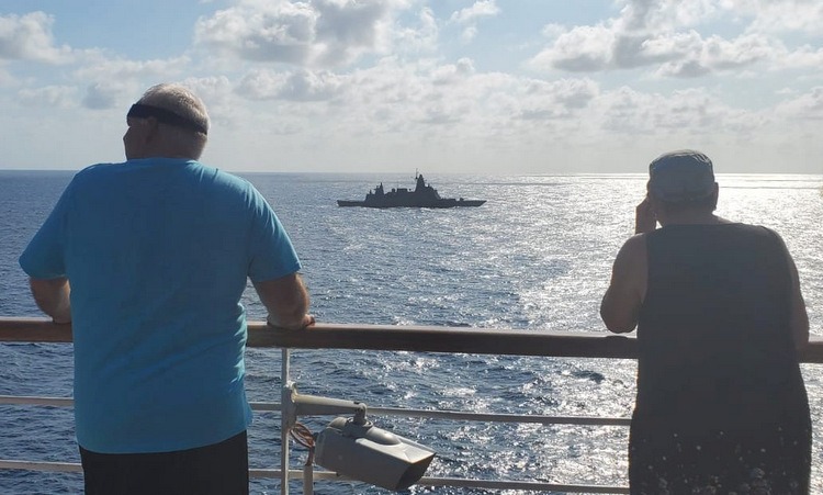 Hành khách trên tàu MS Westerdam quan sát chiếc HTMS Bhumibol Adulyadej hôm 12/2. Ảnh: Reuters.