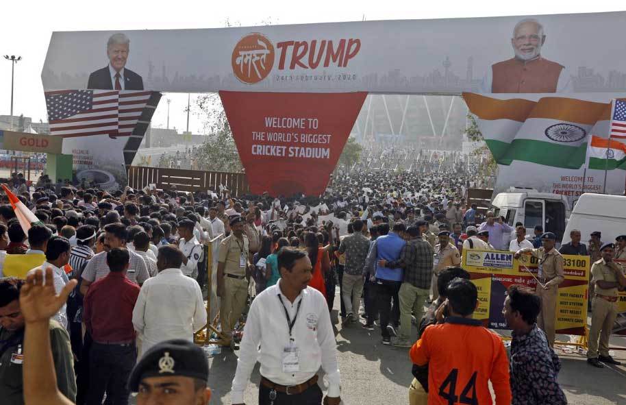 Ông Trump sau đó được tiếp đón tại một sân vận động 110.000 chỗ trong thành phố. Hàng vạn người Ấn Độ đã ngồi kín sân vận động criket lớn nhất thế giới.