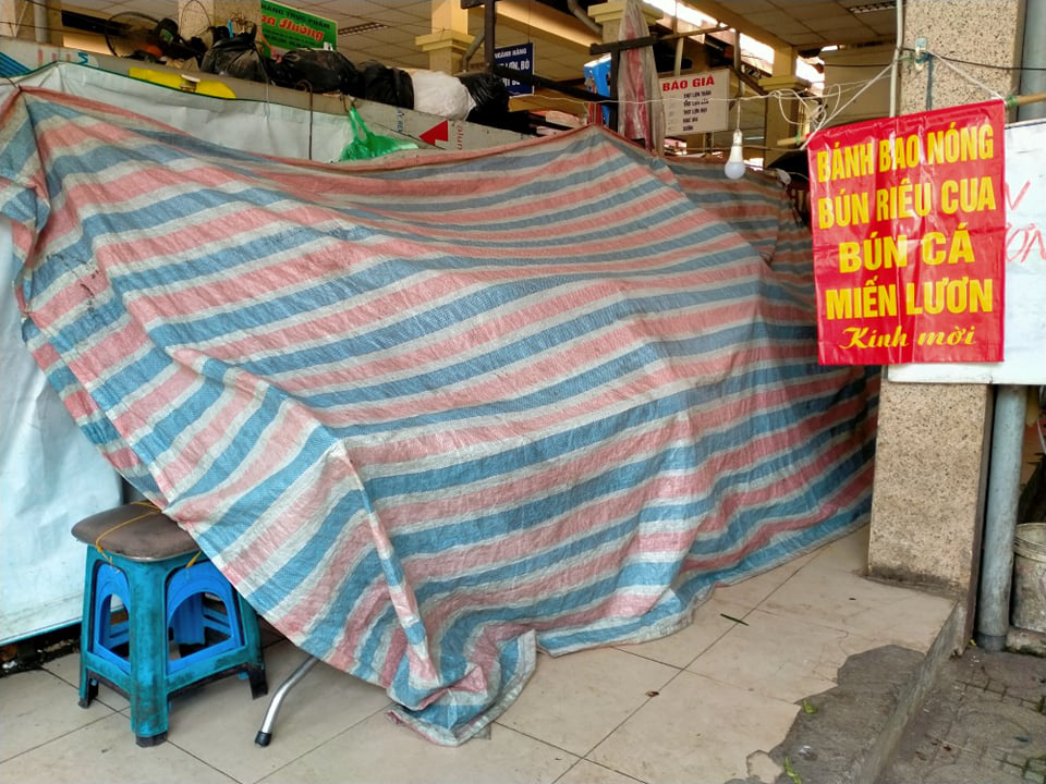 Tại chợ Ngọc Hà (quận Ba Đình, Hà Nội) nhiều hàng quán phủ bạt, không có người buôn bán, trong khu vực bán thực phẩm của chợ chỉ lác đác vài quầy. Vắng khách, câu chuyện các chủ quầy ở đây trao đổi với nhau chủ yếu vẫn liên quan đến tình hình dịch bệnh Covid-19 tại Hà Nội.