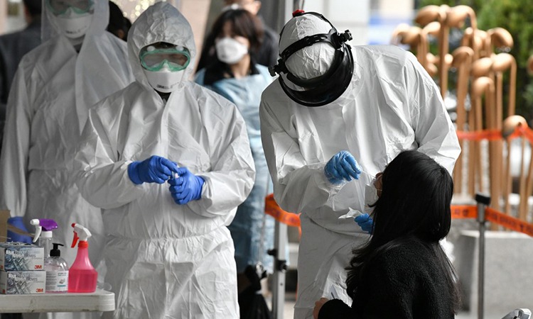 Nhân viên y tế Hàn Quốc ngày 10/3 lấy mấu xét nghiệm cho người lao động tại một tòa nhà ở Seoul, nơi phát hiện 46 ca nhiễm nCoV. Ảnh: AFP.
