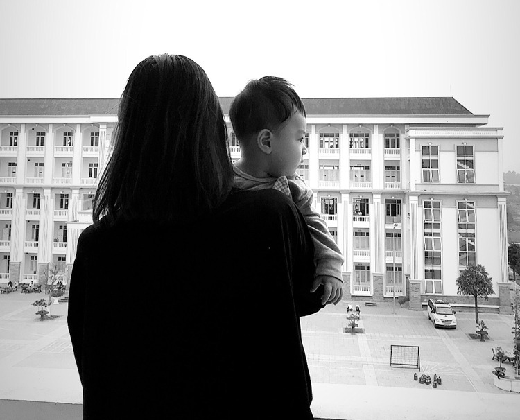 Kim Chi và bé Khánh Đăng chiều 10/3 tại tầng 4, khu cách ly Trường quân sự Sơn Tây. Ảnh: Nhân vật cung cấp.