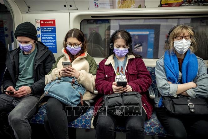 Hành khách đeo khẩu trang phòng dịch COVID-19 khi lưu thông trên tàu điện ngầm ở London, Anh ngày 18/3/2020.
