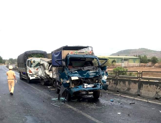 Tại hiện trường, 4 xe tải tông dính vào nhau. Hai xe biển số Khánh Hòa và Đồng Nai nằm giữa hư hỏng nặng.
