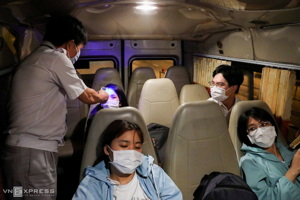 Nhân viên y tế đo thân nhiệt cho những em nhỏ trên xe. Những người có thân nhiệt cao (từ 38 độ C trở lên) sẽ được giữ lại khu vực riêng tại trạm để theo dõi khoảng 30 phút và đo lại. Nếu thân nhiệt dưới 38 độ C, người dân sẽ được đi tiếp, nếu vẫn cao sẽ được đưa đi cách ly.